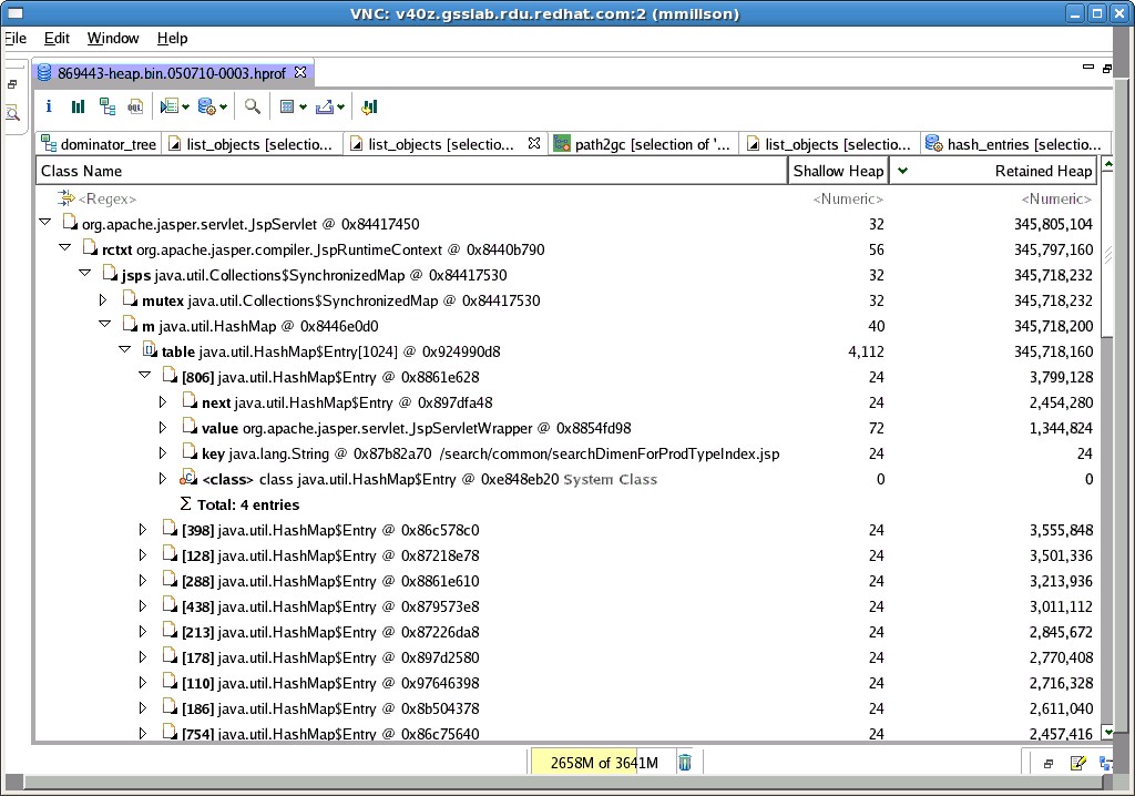 - Verify the JspServlet retention is related to many JspServletWrapper objects stored in the "jsps" SynchronizedMap in the "rctxt" JspRuntimeContext reference held by JspServlet. See attached JspServlet-retention.png.